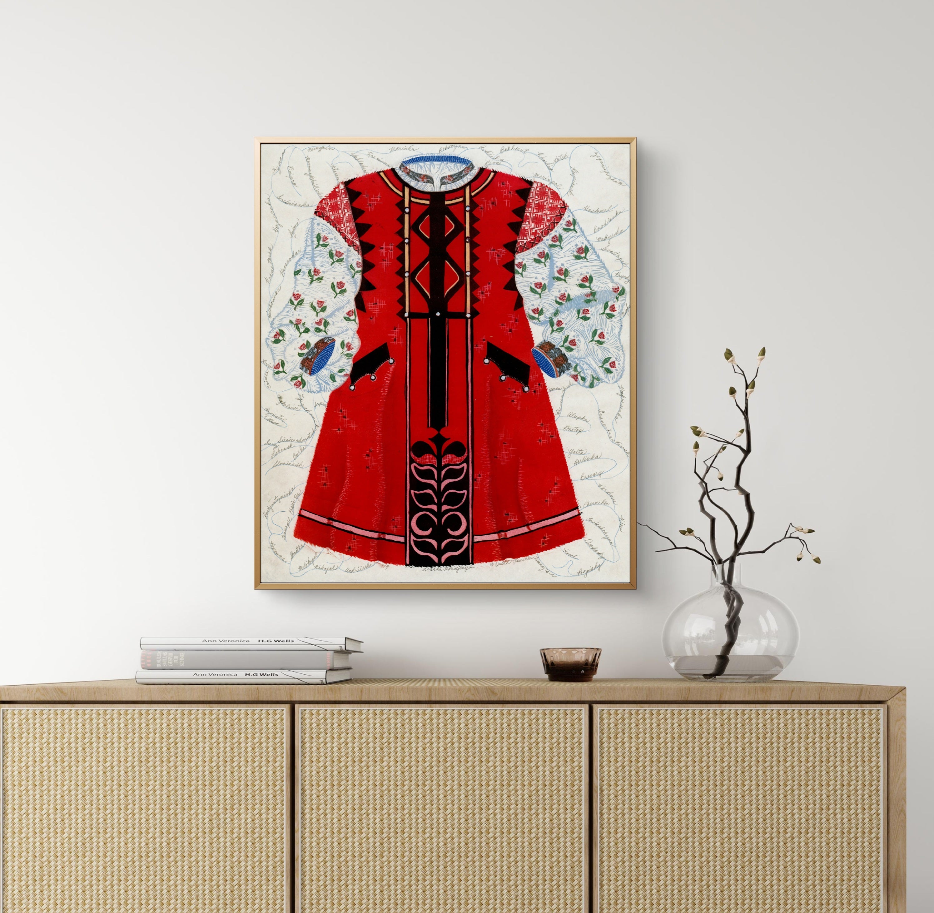 An original woodcut print edition of a traditional Ukrainian folk dress and embroidered blouse. This is based on my research into Ukrainian embroidery throughout the centuries. This totemic image is the result of multiple rough sketches, and represents a traditional smock of red wool embellished with black applique, worn over a folk blouse of white cotton with colorful embroidery details on sleeves, collar, and bodice.