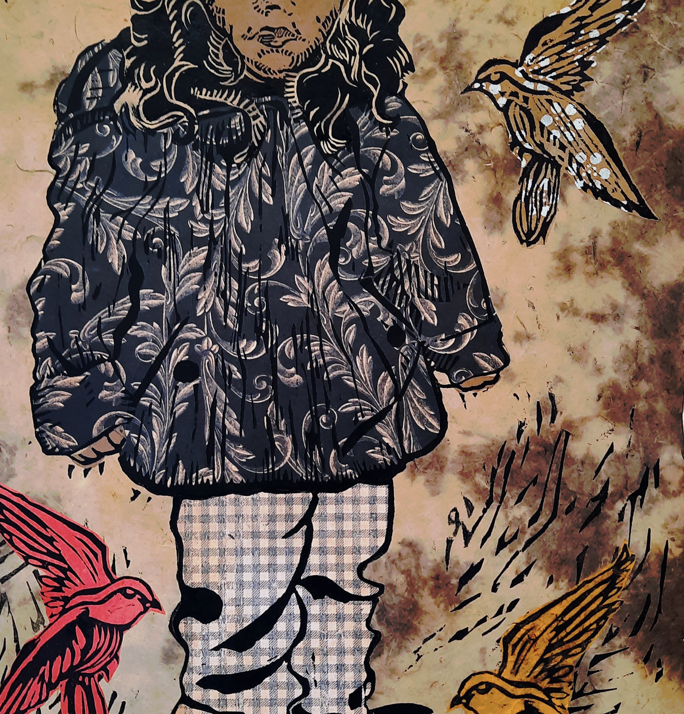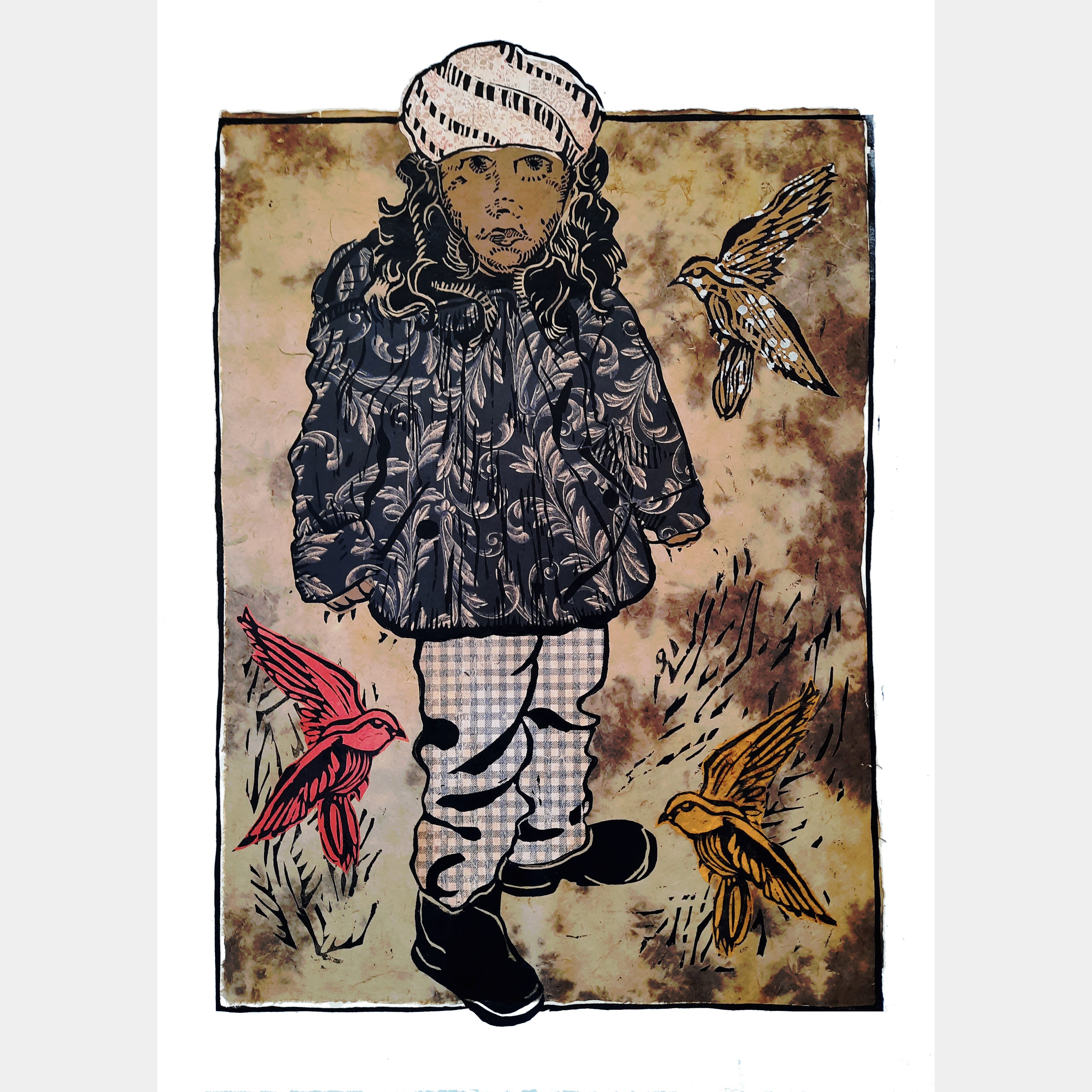 Woodcut print with chine colle, mounted on heavy acid free white paper and ready to frame. The songbirds are also woodcuts hand printed in different colors. One of a kind.