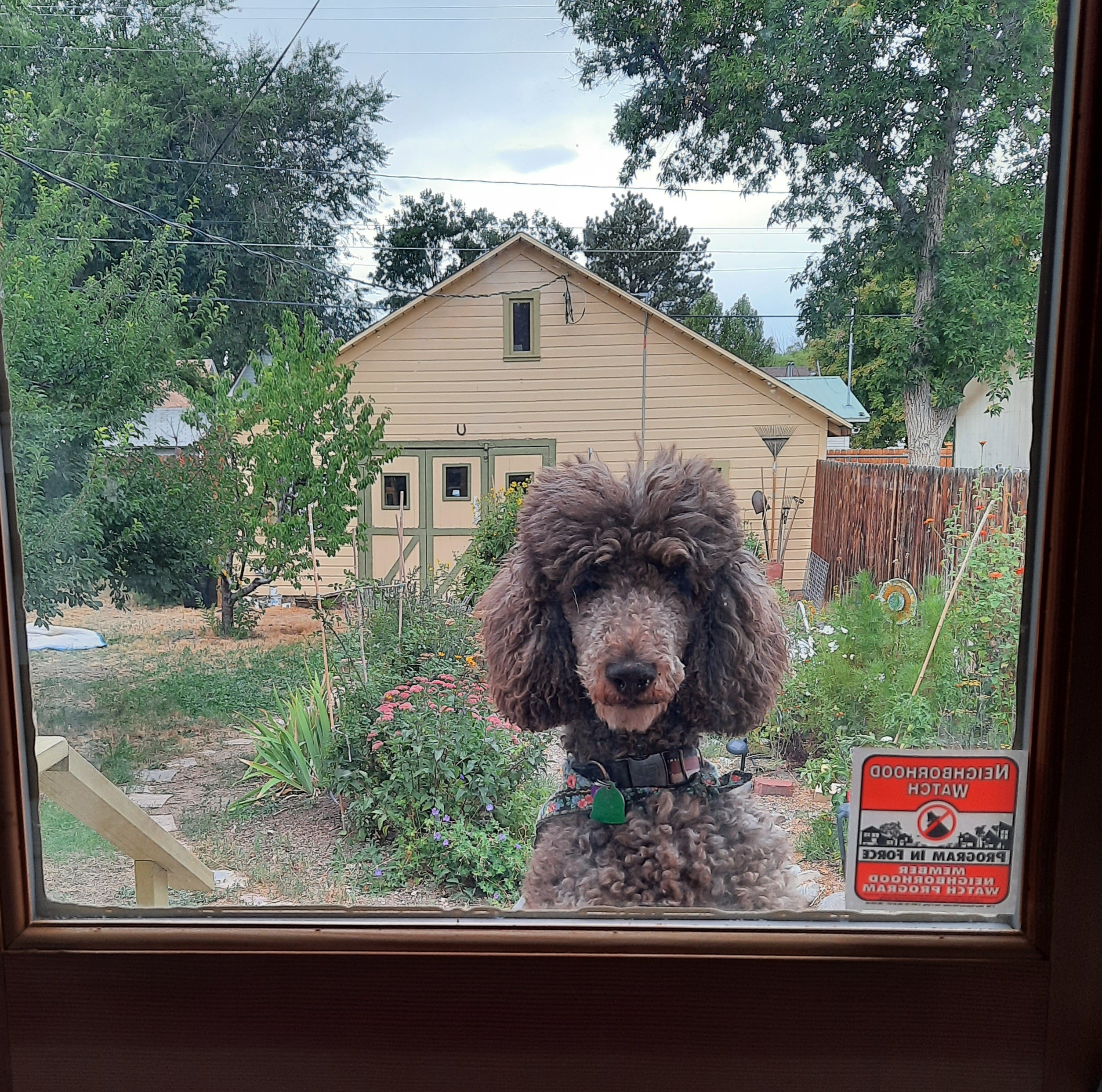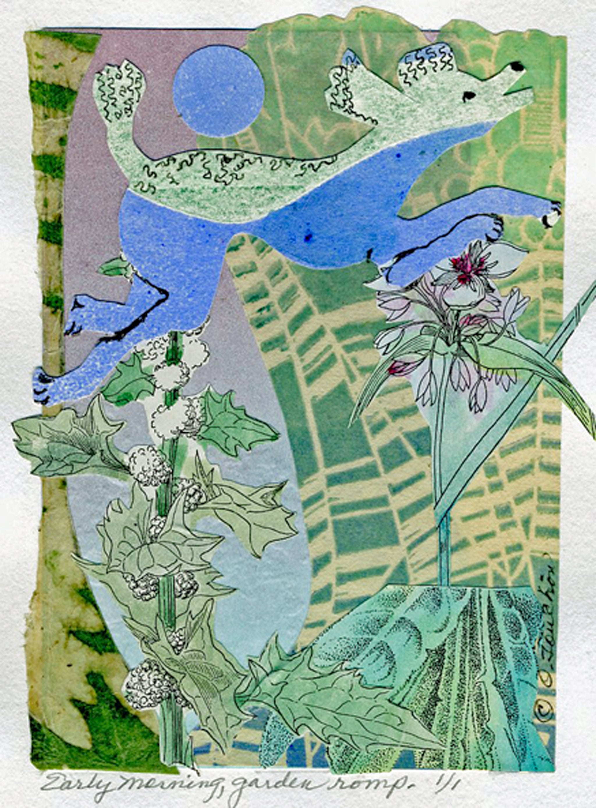 Early Morning Garden Romp. This is a series of miniature mixed media pieces on archival white paper. Hand colored botanical drawings, printed paper fragments and Jane the poodle.