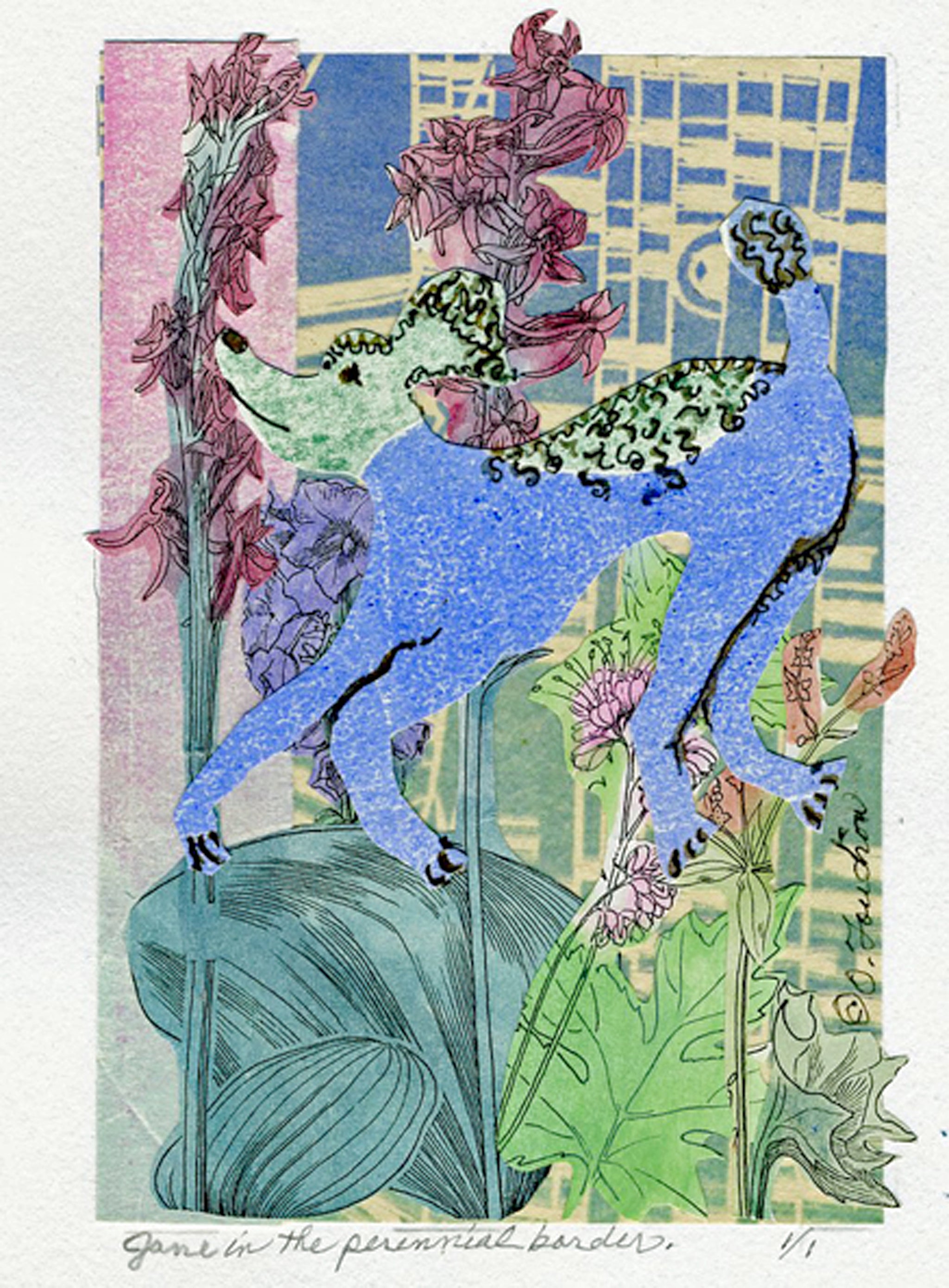 Jane in the Perennial Border. This is a series of miniature mixed media pieces on archival white paper. Hand colored botanical drawings, printed paper fragments and Jane the poodle.